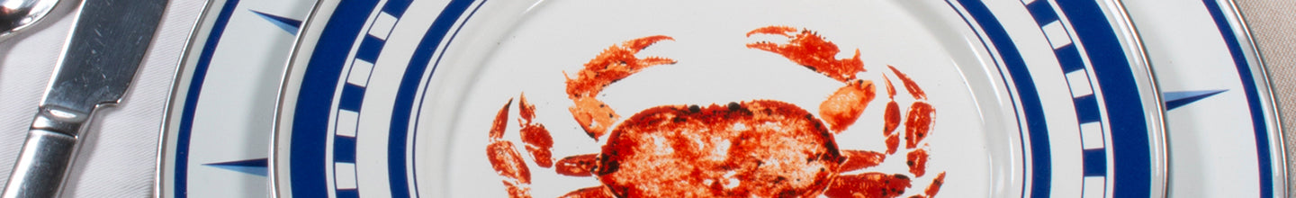 The eye-catching contrast of bright red crab designs and dark blue elements offer an exciting plus to your kitchen and table. Browse our variety of cookware, serveware and tableware. We even have elegant and welcoming red crab themed salt and pepper shakers!
