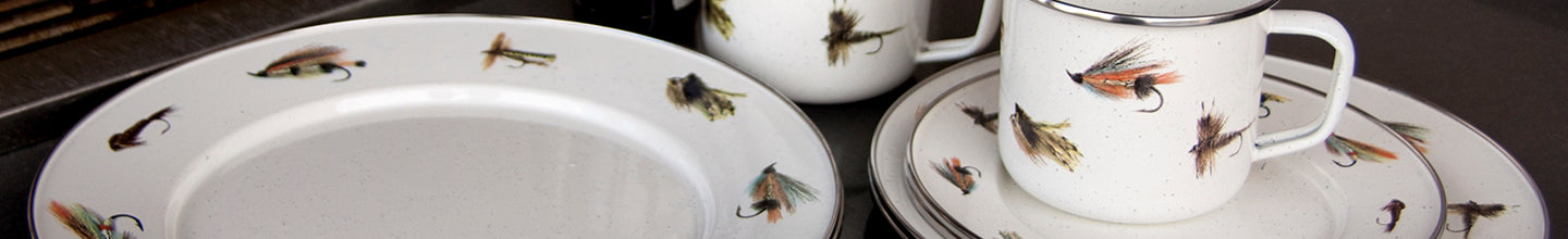 Whether you wish to add some flair to your home or to your table setting at your get-away cabin, these enamelware bowls, mugs, plates and more featuring colorful fly fishing lures are the perfect addition. Their durable quality means the design won’t fade away even after heavy use. View the various designs below and mix and match with other colors and designs to create your own style!