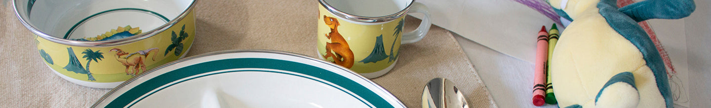 Our child enamelware makes every meal special. Children will want to finish their meals to uncover their favorite character underneath. Dinosaurs, silly cats and dogs, fun nursery rhymes, bunnies, butterflies and more are laid into our durable enamelware. Please look through the vibrant, detailed and pristine designs that include world renowned Beatrix Potter child set designs here.