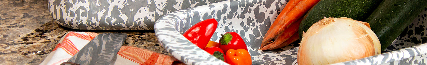 If you want a truly unique addition to your kitchen and table decor, grey swirl enamelware will bring a quiet sophistication to your setting. It’s understated spatterware and multifunctional use will prove an invaluable addition to your kitchen and meals. Our enamelware can be used for cooking, baking, and grilling, even at high temperatures, can be cut on and used to serve your guests at the table. Find the pieces that speak to you or mix and match with other colors and designs.