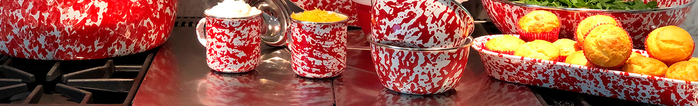 Accent your table setting with the bold red and crisp white swirl option. Designed with a casual sophisticated style, the red swirl enamelware will brighten your table and add an air of liveliness. Make cooking, serving and storing your meals even easier so you can spend more time with your guests. Our serveware is high quality and hand-dipped by skilled artisans to create these unique, chic and elegant spatterware enamel pots, platters, pans and much more! Find the right choice to brighten up your kitchen and gatherings. Mix and match to create your own unique style!